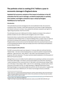 The pothole crisis is costing £14.7 billion a year in economic damage in England alone Updated full economic analysis of the impact of potholes in the UK evaluates the full cost in damage, accidents (especially to cyclists), time wasted, and higher emissions says a study by Douglas McWilliams for FairFuel UK Introduction I first estimated the economic damage from the cost of potholes for Cebr, the economics consultancy which I founded, in April 2024. Because the crisis shows no signs of going away and interest continues to increase, I have updated the estimates I prepared a year ago for my regular blog and podcast, View From the Tent. The estimated annual cost in 2023 was £14.4 billion; despite an increase in the number of potholes mended, the cost in 2024 has still managed to rise to £14.7 billion. Anyone who drives or cycles will be aware that Britain’s pothole crisis is serious. Having completed the 2019 ‘Peking to Paris’ car rally from Beijing to Paris, my take is that our roads are now worse for potholes than anywhere on that rally apart from the Far West of China and Mongolia (where we had to drive across the Gobi desert where the unsurfaced tracks are even more boneshaking than British roads) and notably worse than in both Russia and Kazakhstan, let alone Western Europe. Current progress with potholes The RAC’s annual pothole report was released on 15 January 2025 and confirmed that their ‘Pothole Index’ – the risk of a driver breaking down as a result of a pothole compared with the 2006 base – fallen back from 1.69 in 2023 to 1.39 in 20241. But the fall appears to be only temporary. RAC also observed a 17% jump in pothole related breakdowns in the final quarter of 2024 over the previous quarter. Although there is now a £1.6 billion fund for additional local spending on potholes announced in the October 2024 budget2, this follows a period where English local authorities’ spending on ‘routine maintenance’ fell in real terms from £1,756 million in the financial year ending in 2006 to £1,276 million in that ending in 20233, a fall of 27.3%. Interestingly, consistent with a trend in many parts of the public services, so-called spending on ‘Highways Maintenance Policy, Planning & Strategy’ (ie local authority staff) rose by 28.2% over the same period. It appears that the amount spent rose in 2023/24 to £1,727 million4 but this figure remains an estimate. 1 https://www.rac.co.uk/drive/advice/driving-advice/rac-pothole-index-statistics-data-and-projections/ 2 https://www.gov.uk/government/news/seven-million-more-potholes-to-be-filled-next-year-as-publicurged-to-report-roads-in-need-of-repair 3 https://researchbriefings.files.parliament.uk/documents/CBP-9975/CBP-9975.pdf and Department for Transport table code: RDC0310 (TSGB0723) 4 Page 5 from https://researchbriefings.files.parliament.uk/documents/CBP-9975/CBP-9975.pdf
