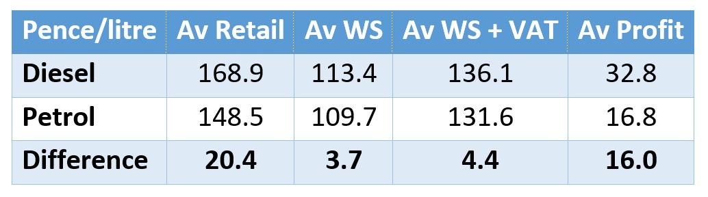 4.4p more than petrol but retail diesel at the pumps has averaged 20.4p more
